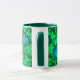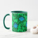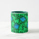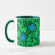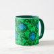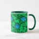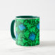 tazón de café con un patrón vintage de damasco floral de William Morris con flores y hojas de anémona, hojas verdes de esmeralda realzadas y coloreadas digitalmente y flores de color azul ceruleano y cobalto sobre un fondo verde esmeralda oscuro