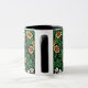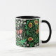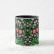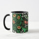 Mug en un vintage William Morris Jacobean patrón de papel pintado floral de tulipanes rosa de coral, margaritas amarillas, violetas azules, delicadas flores blancas y follaje verde jade, sobre un fondo negro, realzado digitalmente y colorido