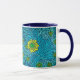 Mug en un Guillermo Morris vintage, Art Nouveau, damasco de caléndulas con hojas y flores, en tonos turquesa, aqua y azul cobalto, acentuado con amarillo y verde limón, sobre un fondo azul marino oscuro