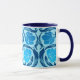 Mug en un patrón vintage William Morris textil de flores y hojas de pentela estilizadas - flores en un gradiente de luz a denim oscuro azul sobre un fondo azul cielo pastel