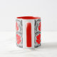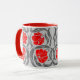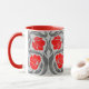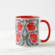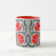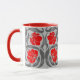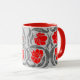 Mug en un patrón vintage William Morris textil de flores y hojas impermeables estilizadas - flores en un gradiente de color rojo oscuro a rojo brillante, con hojas grises/grises de grafito, sobre un fondo gris plateado claro