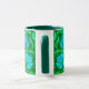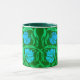 Mug en un patrón textil vintage de William Morris de flores y hojas de pentela estilizadas - flores en un gradiente de azul ceruleño profundo a claro, con hojas verdes de esmeralda clara, sobre un fondo verde esmeralda profundo