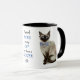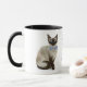 Here's the perfect latte mug for the Siamese cat owner! At each side is a portrait of a blue eyed Siamese cat wearing glasses and a blue bow tie. Between the images is black and blue text that says "I work HARD so my CAT can have a BETTER life". Cute!