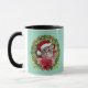 Un tabby con un sombrero de Santa Claus mira desde un almacén de Navidades.