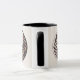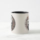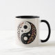 This mug features a digital yin-yang symbol illustration with a celestial and botanical theme. The left side (yang) is white with a black circle in the center amid stars, while the right side (yin) is black with a white circle in the center also amid stars. Both sides feature decorative leaf patterns in earthy tones of brown, rust and olive green. The leaves are arranged in curved branches that wrap around the circular design. The stars are depicted in a minimalist style with sharp points, arranged in a circular pattern around the central circles. The background is a solid cream beige color. The design combines elements of traditional Asian philosophy with contemporary botanical and astronomical motifs. The mug is a black and white combo mug. The mug has a black glaze interior and handle. The mug is microwave and dishwasher safe.