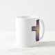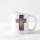 Esto es una taza de café cristiana adornada con un diseño cruzado púrpura.