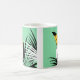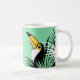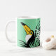 Arte estilizado de ave tucán entre frondas de palmeras tropicales