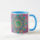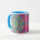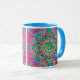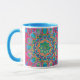 Arte abstracto en sobre todo rojos, rosas, y azules. La forma de una flor en la floración con los pétalos verdes y azules rodeados por un modelo rojo y púrpura del caleidoscopio.