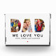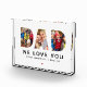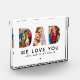 Un bloque de fotos de acrílico con el corazón que presenta "Te queremos" en tipografía en negrita con un acento de corazón, múltiples fotos familiares personalizadas y nombres de niños personalizados. El diseño blanco limpio deja que las fotos y el mensaje tomen el centro del escenario. Todo el texto es totalmente personalizable. Impreso en acrílico de grado A de 1 pulgada de grosor, este bloque de fotos se sostiene sobre cualquier superficie plana sin soporte, un regalo significativo para papá en el Día del Padre, su cumpleaños o cualquier ocasión.