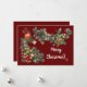 Una tarjeta roja preciosa, de esas que calientan el corazón al instante. En la parte delantera, hay una rama de árbol de Navidad ricamente decorada, adornada con adornos brillantes y luces centelleantes. Justo debajo, en letra elegante, dice "Feliz Navidad".