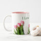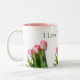 Diga "te amo, mamá" con esta taza preciosa. Una fotografía original de los tulipanes frescos bonitos del rosa del corte está en todos los lados. Fácil personalizar para ella y cambiar el texto con cualquier nombre, decir, o aún dejar hacia fuera las palabras si usted quiere. Recuérdela su amor diario como ella bebe su bebida.