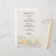 Personalizar el elegante Tea Cup y el menú Boda de la Rosa Blanca con los detalles de la comida que se sirven en el fiesta de té ducha de novia a mediodía, brunch postboda o cena en la recepción matrimonial añadiendo la ensalada o el primer plato, entrante o segundo y postre o tercer plato. Personalízalo con los nombres de la novia y el novio, el lugar del evento y la fecha. En este elegante menú personalizado de boda de té se sirve una fotografía floral de un té y un platillo con bordes dorados y una flor de rosa blanca con raso blanco.