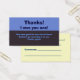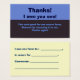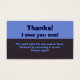 "¡Gracias! ¡Te debo uno!" Esto es lo que esta carta dice en la parte delantera, junto con "Esta carta es buena para un favor de retorno. Canjéelo devolviéndome. ¡Gracias otra vez!" En la parte posterior puede escribir información más específica sobre el favor. Sabes cómo va esto; alguien te hace un gran favor, y tú dices "Gracias, te debo uno", pero...en realidad no lo creen. Con esta tarjeta puedes mostrar que realmente aprecias sinceramente lo que han hecho por ti, y demostrar que REALMENTE tienes la intención de ayudarles cuando lo necesiten. Por supuesto, esa área en la parte de atrás donde dice "Comentarios" es un buen lugar para escribir en lo que NO HARÁS por ellos jajaja...como pintar su casa, o doblar la verdad para sacarlos de un lugar apretado; tus límites están a tu disposición. Esto es "algo así" sólo por diversión, pero de nuevo, como dije, a veces quieres que la gente sienta realmente el impacto de tu profunda deuda de gratitud, y esto lo hará de una manera desenfadada sin hacerte incómodo.