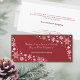La tarjeta plana de felicitación Woy You a Season of Growth es la forma perfecta de enviar saludos de vacaciones personalizados a sus clientes de gran valor. Como parte de la colección Life Coach Red & White Branding Package, esta tarjeta incluye elegantes copos de nieve iluminados con estrellas en la parte delantera con un rico fondo rojo, lo que mejora la marca de su empresa. La parte trasera ofrece espacio para un nombre escrito a mano, añadiendo un toque personal a tu mensaje de vacaciones. A continuación, una sincera nota de agradecimiento y un regalo especial de su empresa. Debajo del nombre de su empresa, hay espacio para su número de teléfono, sitio web y detalles de dirección. A lo largo de la frontera inferior, la tarjeta invita a los clientes a "For Daily Affirmations - Follow Us!", con iconos de los medios sociales y el nombre de su entrenador de vida para concluir el saludo festivo. Para obtener más información sobre la creación de marca o ayuda con la personalización, visite www.KBMD3signs.com o póngase en contacto con nosotros en info@KBMD3signs.com para obtener información sobre el diseño personalizado.