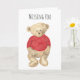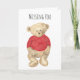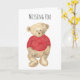 ¿Has estado pensando en alguien que no has visto en un tiempo? Hágales saber que te importa esta sencilla pero dulce tarjeta acuarela de oso de peluche "Missing You". Un oso de peluche de aspecto triste vestido con un suéter de punto rojo se sienta delante de la tarjeta, mirando con desdén al destinatario. El mismo osito de peluche mira al espectador en el interior de la tarjeta debajo del texto, "¡Espero verte pronto!" Esta sería una buena carta para enviarle a un viejo amigo, especialmente a un amante de los osos de peluche con el que no has hablado en mucho tiempo.
