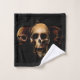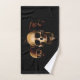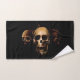 Tres cráneos humanos contra una gota de negro. Un pequeño criador asomando desde el cráneo medio.