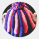 Té rosa y azul vintage de punto a mano sobre una tetera blanca.