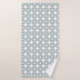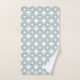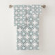 A patterned towel and matching washcloth are displayed. The design features teal and white geometric motifs, conveying a clean and modern aesthetic.
