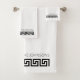 Haz una declaración audaz en tu baño personalizado con esta toalla griega negrita. El patrón de la clave griega nunca se quedará de moda. Combine este conjunto personalizado con una alfombra de baño y una cortina de ducha para un completo estilo clásico-moderno. Juego de toallas de baño con llave griega moderna y blanca personalizada.
