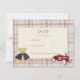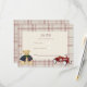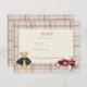 This charming RSVP card is perfect for your little one's upcoming baby shower. Featuring a whimsical teddy bear in a plaid coat and a vintage red race car set against a cozy, stitched plaid background, this design evokes a sense of nostalgic playfulness. It's ideal for a boy's baby shower or any theme celebrating childhood wonder. The soft, muted color palette and hand-stitched details add a unique, artisanal touch that guests will appreciate. Ensure you receive all your guest responses with this delightful and coordinating addition to your baby shower invitations.