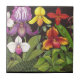 Diseño original de la bella arte de Paphiopedilum colorido y de Phragmapedium u orquídeas del deslizador de señora del artista Carolyn McFann en una teja de la calidad para los amantes de la orquídea.