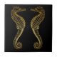 Silueta hermosa de la teja de oro del Seahorse de la criatura del mar en oro en fondo negro.