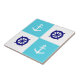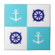 La teja azul y blanca del tablero de damas tiene un ancla blanca del barco y rueda de un capitán azul.