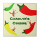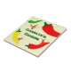 Condimente para arriba su cocina con esta teja personalizada pimiento picante de los cangrejos. La teja ofrece las pimientas de chile rojas, verdes y amarillas con un cangrejo del chica que sostiene una cuchara de madera y una salsa caliente mientras que dos crawdads del muchacho ayudan con las pimientas. Personalice la teja usando la plantilla. Todo el texto es adaptable. ¡Un gran regalo para ese cocinero de Cajun en su vida!