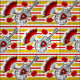 Diseño caprichoso de estilo retro con recuerdos de una fiesta española; guitarra de hierro forjado, abanico de encaje y rosa roja, sobre un fondo decorativo a rayas. Un diseño de personalizable en blanco, negro, rojo y amarillo dorado para que puedas personalizar con tu propio texto, imágenes e ideas. Imagen original de arte digital.