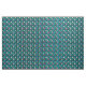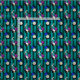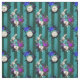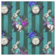 Este diseño audaz y vibrante inspirado por Alicia en el País de las Maravillas tiene conejo blanco, relojes y rosas en un fondo de rayas verticales verde azuladas y verdes.