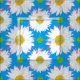 Una tela floral muy bonita con un modelo inconsútil de repetición de margaritas en un fondo del azul de cielo que usted puede cambiar si usted desea. La parte colección de la "de las cadenas de margaritas elegantes y Painterly, este modelo es de un collage de papel pintado a mano de Judy Adamson.