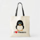 Amo la bolsa de asas de los pingüinos (del corazón). Seleccione de una variedad de estilos y de colores del bolso. Idea del bonito regalo para los amantes del pingüino y los amantes del pájaro. Tienda del diseño del penique del © del pingüino