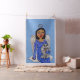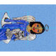 Esta tela personalizado del patio tiene un ángel de arte folclórico bonito con ojos azules brillantes vestido de azul con estrellas blancas sentadas en una nube blanca sosteniendo a su gato angel blanco y gris. Ambos tienen halos plateados sobre fondo azul cielo.