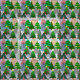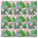 Esta tela tiene un diseño de árboles navideños en diferentes tonalidades de verde, rosa, plata y oro con diferentes decoraciones.