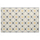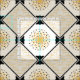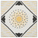 El patrón original de este tejido hecho de personalizado fue creado por el artista digital Leslie Sigal Javorek e inspirado en el Art Deco de los años 20. Sobre un fondo blanco roto, el medallón central del patrón repetido es una ráfaga de sol estilizada de color amarillo girasol brillante con agudos rayos angulados. Se colocan en el punto esquinas de fotos negras rodeadas por un borde de la cadena de púa de guitarra negra, y en cada una de las cuatro esquinas hay bloques de varias líneas negras finas alternando dirección y separadas por rayos solares amarillos horizontales.