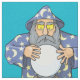 Viejo mago con capa azul mirando la bola mágica de cristal.