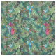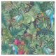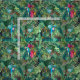 Aves tropicales entre hojas verdes de plantas y follaje entrelazado rodeado de flores con fondo de puesta de sol