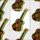 Un ilustracion de una guitarra acústica con la bandera de Jamaica pintada en ella. El fondo es un patrón de siluetas de guitarra en los colores de la bandera rastafari, rojo, verde y dorado. Un divertido diseño para reggae, ska y fans de la música jamaiquina.