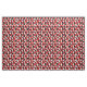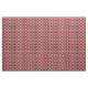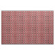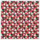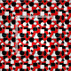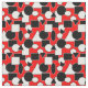 Esta tela tiene un diseño Bauhaus de triángulos, círculos, rectángulos y pentagones en blanco y negro sobre un campo de rojo.