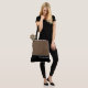 Esta encantadora bolsa de mano con estilo muestra la palabra "Dama de honor" en color de texto blanco sobre negro con la parte superior de la bolsa en un marrón Latte personalizado. Tiene mucho espacio para texto personalizado. Los gráficos y el texto están en ambos lados de esta bolsa de mano. Asa negra. Personaliza aún más o compra tal como se muestra.