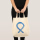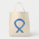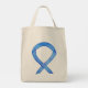 La bolsa tote presenta arte de la cinta de conciencia azul. El color azul de la cinta de conciencia significa apoyo a la ELA, libertad de expresión, conciencia sobre el cuidado de crianza, cáncer de colon, abuso infantil, conducción en estado de ebriedad, educación, artritis, enfermedad de Huntington, trata de personas, fin al acoso y salvar la música, entre otros. ¡Deja que la cinta de conciencia azul ayude a apoyar la conciencia para estas causas!