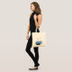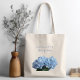 Bolsa de tela con flores de hortensias azules. Bolso para cortejo nupcial con dos líneas de texto para nombre y título. La letra cursiva verde oscuro es fácil de personalizar para una novia, dama de honor, madrina de honor, dama de honor joven o niña de las flores. Las bonitas flores de hortensia azul claro en tallos con hojas verdes es el diseño que se imprimirá en un lado de su elección de estilo de bolsa.