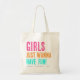 Bolso de soltera divertido y moderno con diseño femenino. El diseño incluye el texto 'LAS CHICAS SOLO QUIEREN DIVERTIRSE', el nombre de la novia y el año.
