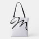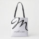 Una bolsa de tote blanca simple y elegante con tu nombre e iniciales en un estilo de letra de guión negro