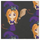 Tela con una bruja linda que lleva un gran gorra de brujas moradas. Su gato negro descansando sobre su cabeza. Ella tiene el pelo largo naranja y lleva una escoba. El ilustracion personalizado es perfecto para halloween.