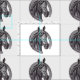 En este patio de tela se repite un boceto blanco y negro de un caballo oscuro y una gran herradura. Esta imagen muestra la forma de fluir y los oídos de alerta de este hermoso animal. El fondo es blanco, pero se puede personalizar a tu gusto.