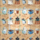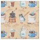 Patrón de café acuarela con una bolsa de granos de café, un molino de café, una taza de café, una cafetera turca, una cafetera y una taza de café para llevar.