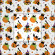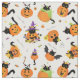 Esta tela adorable presenta gatos negros lindos con calabazas, lámparas de jack o', dulces y texto "Feliz Halloween". Perfecto para proyectos de Halloween.