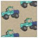 Grandes ruedas, aqua y el diseño de camiones monstruos azules sobre una combinación de colores naturales de tonos tostados y marrones.