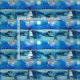 Un paisaje verde azulado, oscuro y azul claro de invierno con renos, un sol pálido, decoración Navidad y un diseño de repetición de snowman